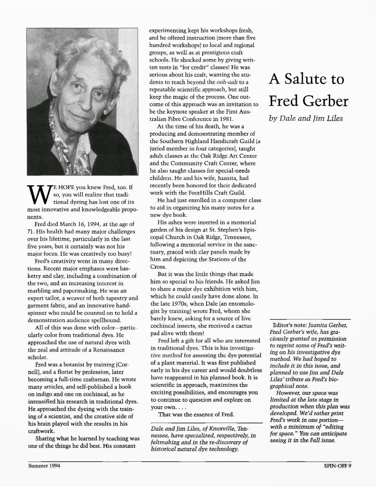 I’ve had an interest in adding information about Fred to our website after hearing Dale’s talk and wrote to Interweave requesting permission to reprint Dale’s article on our website hopeful we could secure it in time for the 20th anniversary of the tribute.
