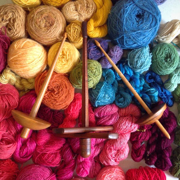 We were also fortunate to meet Lucinda Young at July’s guild meeting this past Saturday. Lucinda is Fred and Juanita Gerber’s niece and a newer TVH member. She brought some of Fred and Juanita’s yarn and spindles from her family’s stash to share with us at the meeting. As you can see the yarn is still delightfully vivid! Some skeins even have the original dye recipe tags attached.